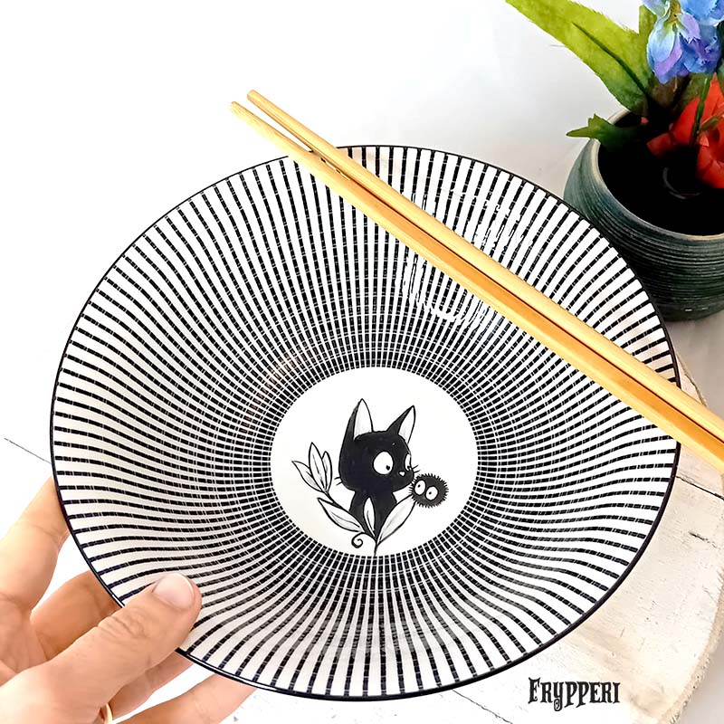 Ciotola Ramen Gatto Nero Jiji dipinto completamente a mano.